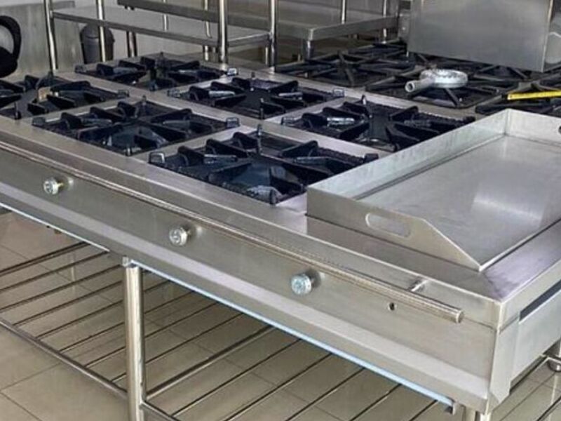 Cocina industrial en acero inoxidable con plancha sandwichera personalizada. Tablero de la plancha de casi 1 cm de grosor en acero inoxidable 304 - 2b mate