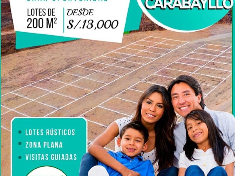 Adquiere un lote de 200 m2 Carabayllo . Grandes facilidades de pago. Entrega inmediata y pre venta . visitas guiadas Los Días Domingos información al WhatsApp 992819861.