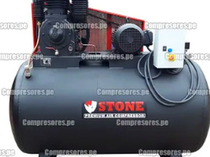 Compresor eléctrico de doble etapa STONE® con cabezal de fierro fundido, motor WEG® de alta eficiencia IP55 para servicio rudo.