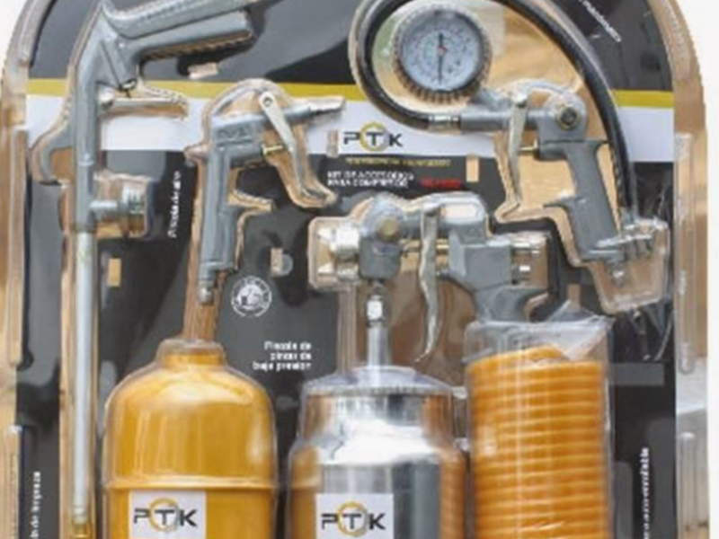 Incluye herramientas como pistolas de aire, infladores de neumáticos, boquillas de aire, mangueras y conectores