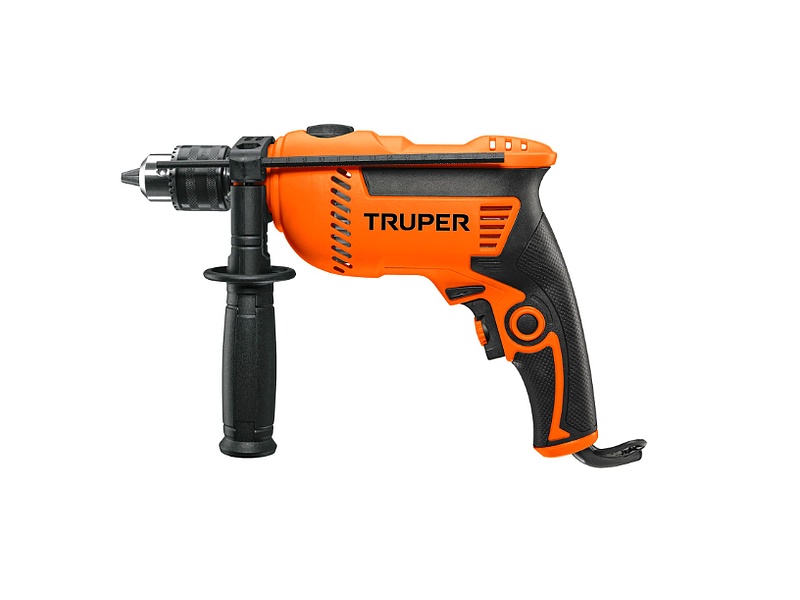El Rotomartillo 1/2" 650W de Truper PRO ofrece potencia y durabilidad con su motor de 650W y baleros de bolas. Cuenta con selector de función taladro o rotomartillo, velocidad variable reversible, y mango auxiliar de 360° para mayor control. Ideal para perforar concreto, madera y metal.