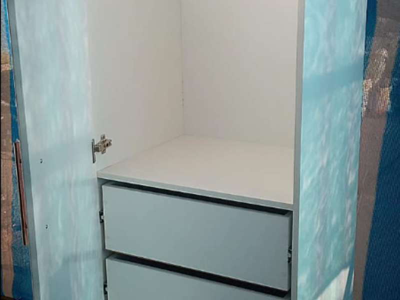 Un clóset pequeño celeste es un mueble de almacenamiento diseñado para organizar la ropa, accesorios y otros artículos en un espacio compacto. Este tipo de clóset tiene un tamaño reducido y está fabricado en un tono celeste, que puede aportar una sensación de calma y serenidad al ambiente. Suelen tener un diseño funcional con compartimentos, estantes y barras para colgar la ropa, adaptándose a las necesidades de almacenamiento de ropa pequeña. Además, suelen estar decorados con detalles infantiles o juveniles para complementar la decoración de habitaciones infantiles o juveniles.