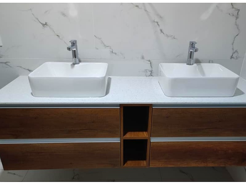Mueble de baño (lavabo) montado en Magdalena, encimera silestone blanco estelar y muebles bajos flotantes en melamina hidrófugo Caramelo 18mm.