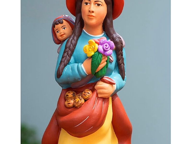 Una mujer andina recolecta flores del campo, su hijo la acompaña colgada de la cintura. Esta encantadora escultura de cerámica está diseñada por Eugenio Gutierrez de Perú. Inspirado por las costumbres de su país de origen, pinta la escultura a mano.