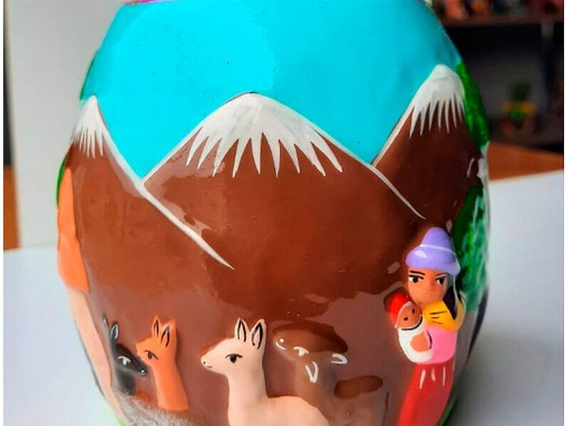 Richard Ore hace el trabajo de pintado y relieve en estas macetas . Esta vez una tierna escena de una cholita y su bebe regresando a casa después del trabajo de campo. Una simpática maceta lista para la decoración – Peso 235 g