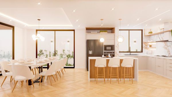 Diseñamos cocina, comedor, bar, sala y recibidor, en un espacio integrado, mezclando madera, piedra y tonos neutros para un ambiente luminoso y sofisticado.