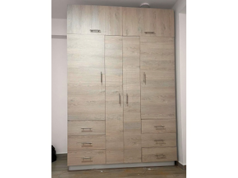 Con un acabado en un suave tono beige, este armario de madera ofrece un diseño funcional que incluye cajones y un amplio espacio para colgar ropa, asegurando que todo esté organizado y accesible.