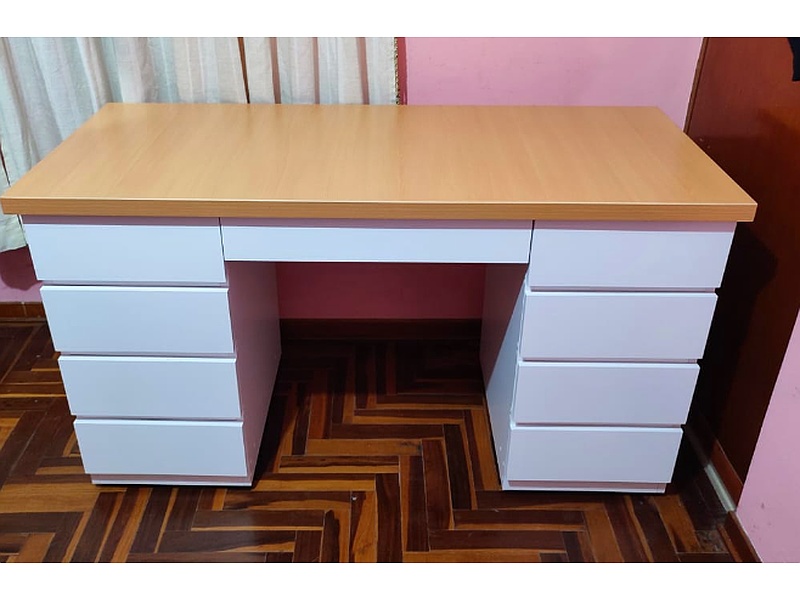 La parte superior del escritorio es una superficie plana donde se puede escribir, colocar una computadora portátil, una computadora de escritorio u otros dispositivos. Esta superficie suele estar hecha de madera, vidrio, metal u otros materiales duraderos.