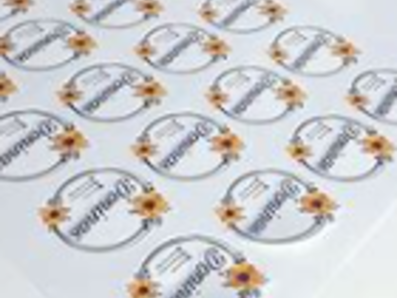 Etiquetas adhesivas impresas con información promocional.