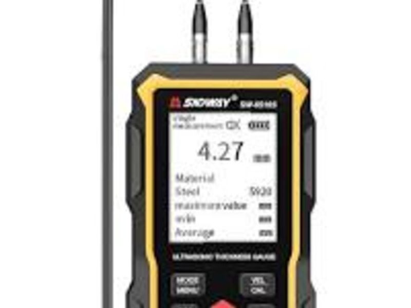 Herramienta manual que mide el espesor de materiales como láminas, placas y tuberías, utilizando un sistema de presión y medición.