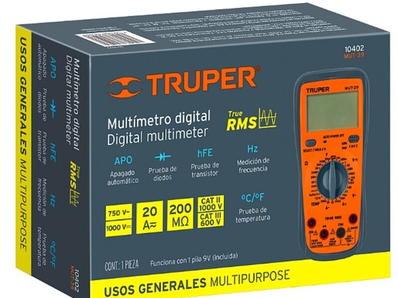 El Multímetro digital profesional de Truper con RMS verdadero es imprescindible para técnicos y electricistas. Fabricado con cuerpo de ABS robusto, ofrece funciones avanzadas como prueba de diodo, continuidad audible y retención de datos (HOLD). Ideal para medición precisa de corriente CC/CA, voltaje y resistencia en aplicaciones de uso general.