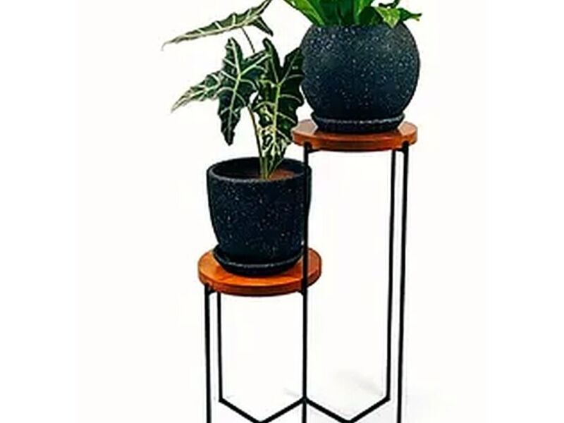 Parante de metal con doble base de madera. Ideal para lucir tus mejores plantas a la altura que merecen.