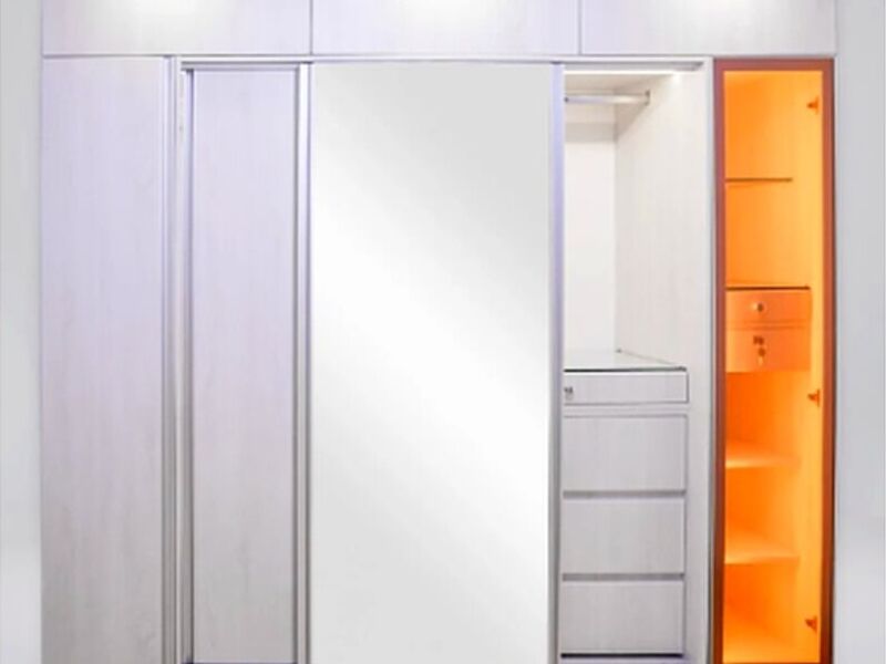 Este closet presenta un diseño moderno y acabado premium con amplios espacios funcionales, una zapatera, joyero y caja fuerte, iluminación LED de 3 tiempos, puerta de vidrio acabado en perfil de aluminio, iluminación con sistema de cinta LED, acabado corte 45, perfil de aluminio, y sistema push.