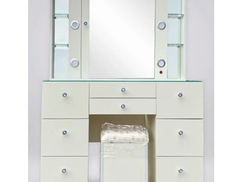 Este tocador presenta un diseño exclusivo con cajones y repisas para ordenar tu maquillaje, iluminación fuerte con foco bombilla, y asiento puff de regalo.